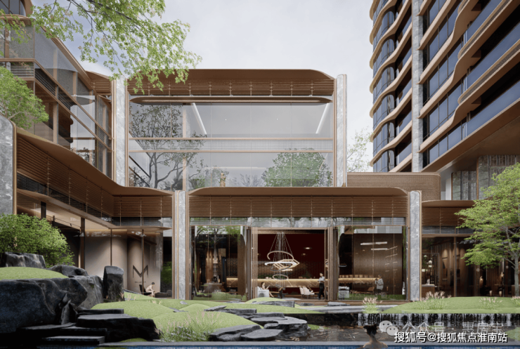 在建筑设计上,GOA大象设计跳出常规住宅的方盒子形态,以徐汇作为中国现代音乐发源地的文化基因为灵感,将“乐器王后”大提琴的优雅弧线,转译成建筑立面的二维曲线语言。通过石材、防铜色铝板、不锈钢和曲面玻璃的精心搭配,采用国内住宅罕见的穿插镂空、楔形线角等细节工艺,让建筑本身成为一件扎根于徐汇文化土壤的巨型艺术雕塑。曲面屏幕墙和全景舱弧形飘窗等设计,不仅弱化了建筑的冰冷感,更极致地优化了室内视野,兼顾美学与居住品质的前瞻性思考,这就是宸嘉一贯的追求!景观设计则由知名景观设计单位迪东、日本皇家园林设计团队植弥加藤联袂打造亲,围绕“禅意和哲学”核心,在社区内精心规划了隐幽、梵音、守拙、不朽、释倦、知行六大主题园景,层层递进,形成秩序丰富、水石叠瀑的景观大赏。其中,专为低密叠加、联排定制的知行景观组团又以 "