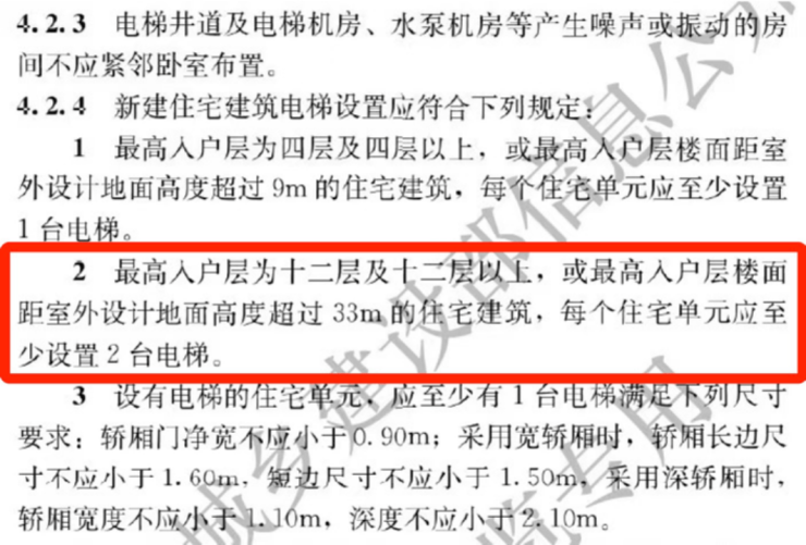 ② 5.1起执行住宅新国标,最高入户层为十二层及十二层以上,或最高入户层楼面距室外设计地面高度超过33m的住宅建筑,每个住宅单元应 至少设置2台电梯。