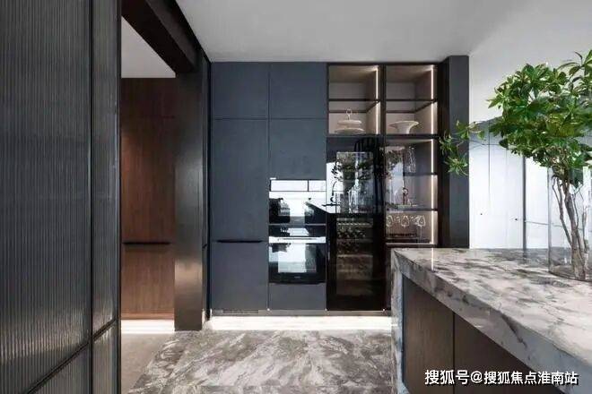 德国柏丽nobilia整体厨房,烤漆门板的选型为杭州壹号院量身定制,仿岩板色与深色木纹的搭配相得益彰,并加上柏丽的深色玻璃吊柜。 定制设计中西双厨或开放式的社交厨房。巧思的细节设计,不论家庭互动还是会客聚友,都可以增加互动,社交无阻。