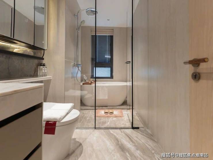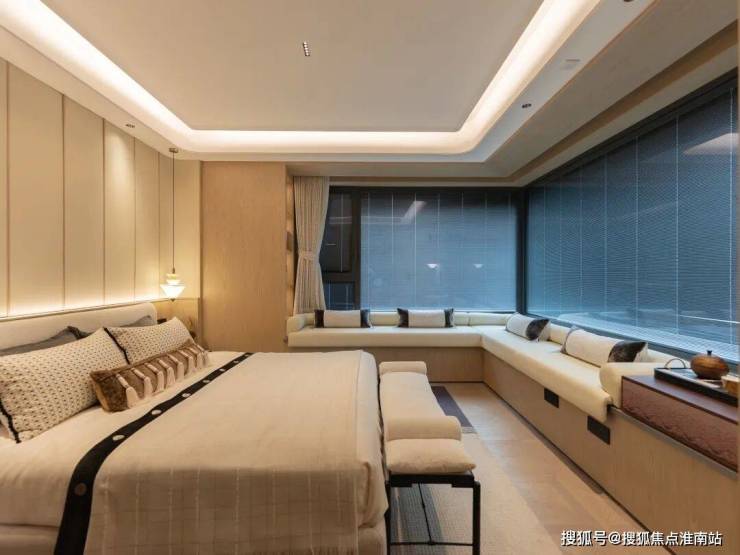 边户主卧套房配置约270°观景飘窗,独立卫生间配备浴缸与通长镜柜,尺度与私密兼具。