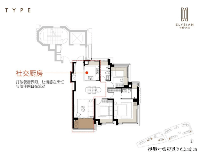 b.客厅非承重墙位于老人房一侧,未来可以自行打通构造出一个X空间,可容纳一孩的多功能房,二孩的儿童房,女主人的化妆间等。