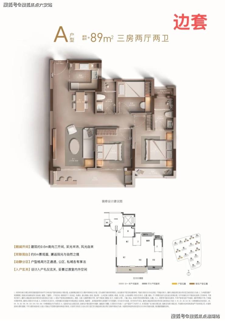 主力产品为建筑面积约89㎡户型,三房两厅两卫格局,南向三开间带宽幕双阳台,轻松容纳三口之家的温情与欢乐;建筑面积约115㎡均为边套户型,纵享丰富观景视野,四房两厅两卫设计并蓄尺度感与尊崇感。