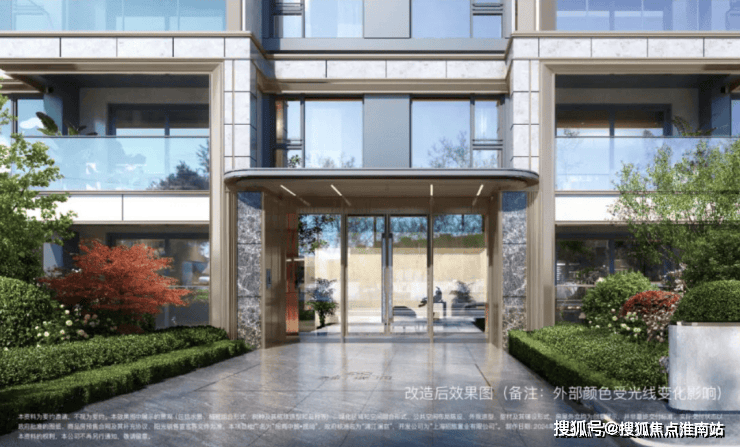 同时, 在入户大厅的外墙上也采用香槟金铝型材与灰色石材,门头雨棚采用香槟金色弧形铝板装饰,搭配大玻璃面,这个颜值和尊贵感,在这个价位段十分难得。