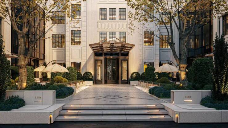 南侧主入口设计借鉴顶级酒店理念,谦和地退隐于百年文保建筑与静谧的内凹花园之后。