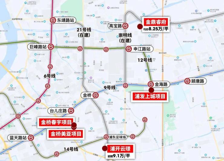 浦发上城地处金桥板块边缘,与曹路板块接壤,但价格参考上则应参照金桥的价格梯度。与浦发上城相差12号线1站路(申江路站)距离的金鼎阅府于今年3月入市,均价7.95万/㎡,两者单价相差约1W;沿14号线2站路(浦东足球场站)的浦开云璟均价8.95万/㎡,单价相差约2W。