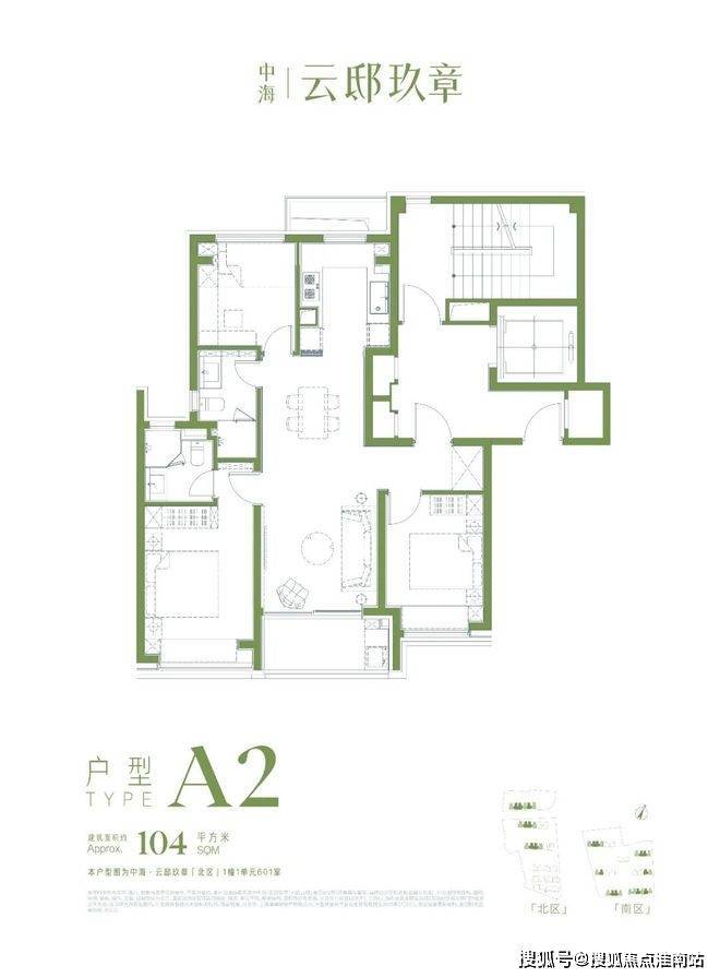 104㎡三房两厅两卫:三开间朝南,南北通透,无连廊设计,得房率高,适合三口之家;
