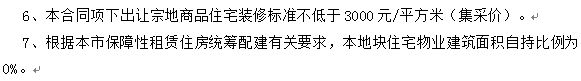 根据土地转让合同要求显示,地块规划住宅下限130套,住宅装修面积比例100%,装标3000元/m²(集采价)。
