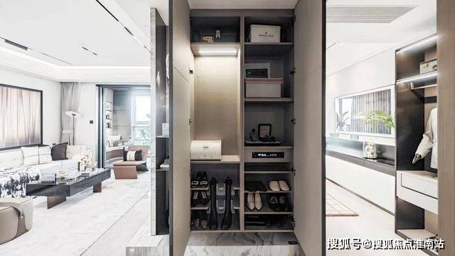 入户后,所有玄关柜均为交付标准,还精心配置了“除臭精灵”,下方更预留了扫地机器人的空间,为日常起居提供便利;像传统的豪宅三大件,项目采用大金品牌中央空调地暖两联供,以及格兰斯柯的新风。