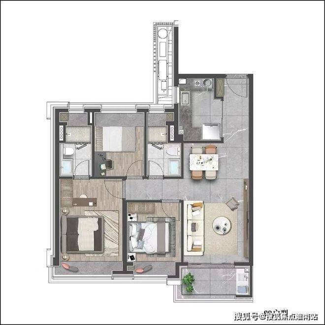 该户型贴合当代人居生活习惯,既适合三口之家小太阳家庭,也可以是三代同堂,每个人都能拥有独立空间。