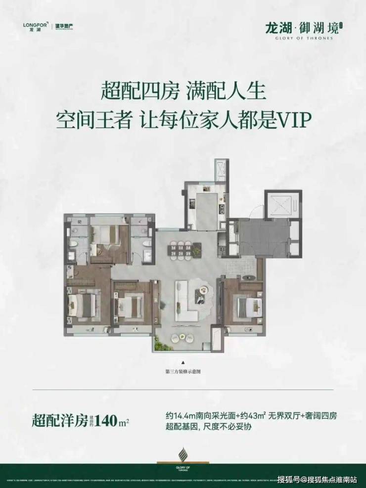 约 140 ㎡超配四房,独立入户玄关,奢阔双厅南北通透,还可改造成约8m巨幕宽厅,部分楼栋还是奉贤新城核心区罕见的洋房业态。