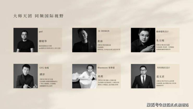 首席制大师团队共创:聚集享誉业界的设计团队——Gad、31DESIGN、GVL怡境、德森、纳沃、Bluemoon布鲁蒙,以全首席制共创。