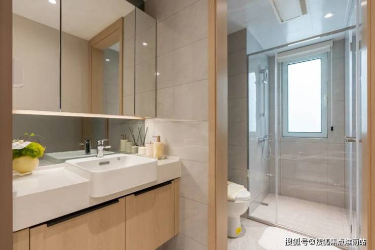卫生间配备台盆柜及镜面收纳,摩恩的五金龙头,科勒的台盆&马桶,奥普的暖风机;淋浴房采用极窄边框淋浴屏,地面采用创新做法,实现防滑、防裂和防变色等优势。