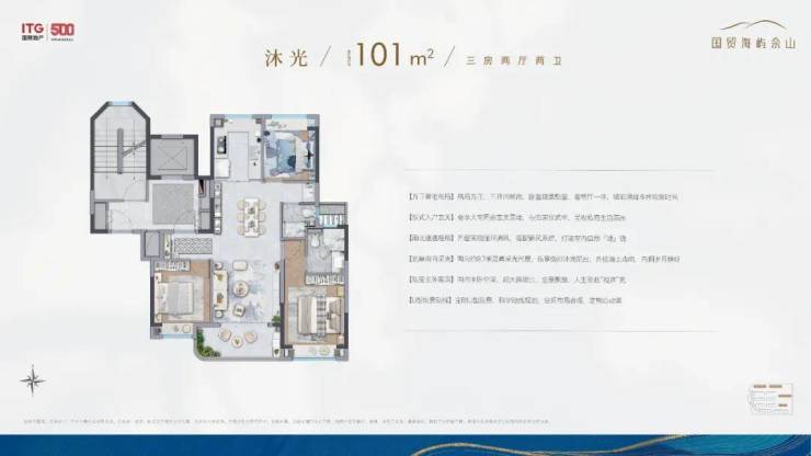 在户型规划上更是凭借小高层无连廊+飞机户型的设计优势,将室内的实际使用空间做到了最大。所以,虽然户型的建筑面积是约101㎡的3房,但整个空间的尺度感却能匹配改善型的宽绰3房。