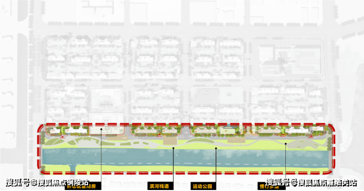 一界面是滨水景观界面(项目红线外),依托南侧的天然水系及滨水公园,打造慢行景观系统,并将滨河栈道、运动公园、骑行等多种功能嵌入,提升舒适度的同时,也为居民提供放松身心的好去处。