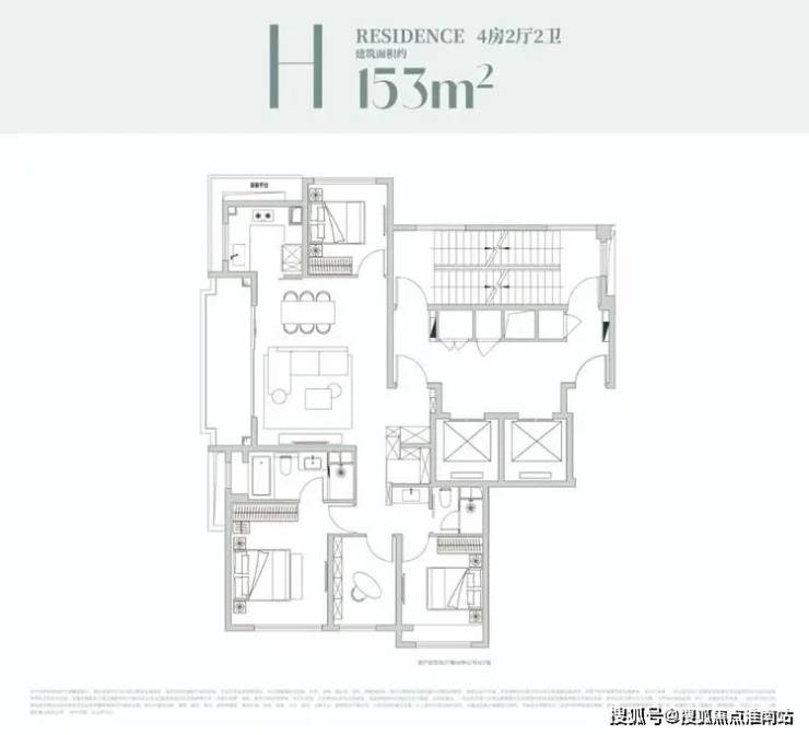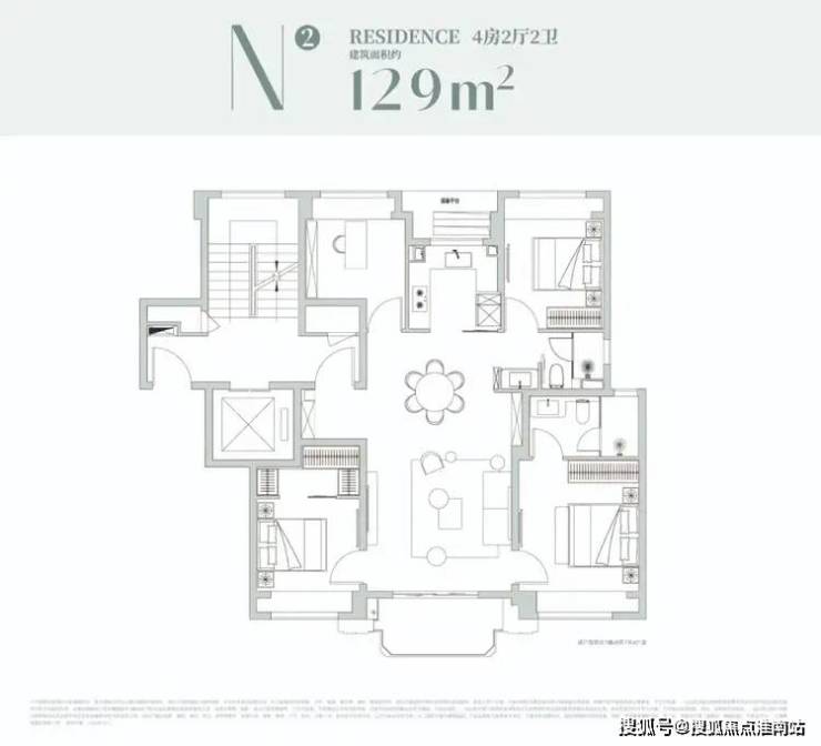 该户型是经典的四叶草布局,四开间分布在四角,兼顾私密与互动,是二胎家庭的优选;