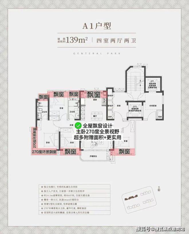 户型设计:主力为建面110-139㎡的3-4房,全明横厅、IMAX巨幕阳台及270°转角飘窗设计,得房率约78%。
