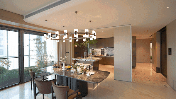 超过60平米的开放式空间(客厅、餐厅、X空间、阳台一体化),功能灵活,可满足大型派对或家庭休闲,尺度感直接媲美原来350㎡的滨江户型。