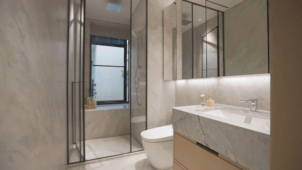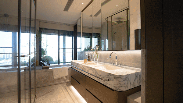 项目的滨江大户型,以无界平层结构,配合3.3米层高(部分)和全景落地窗打造270°环幕江景舱,实现上海滨江市场罕见的IMAX环幕江景视野。