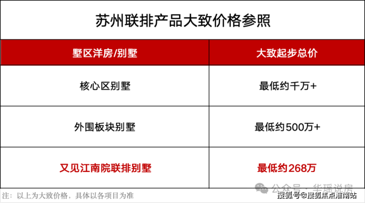 又见江南院售楼处电话☎:400-998-9694 目前苏州市面上的低密项目,价格大致如下,差距一目了然: