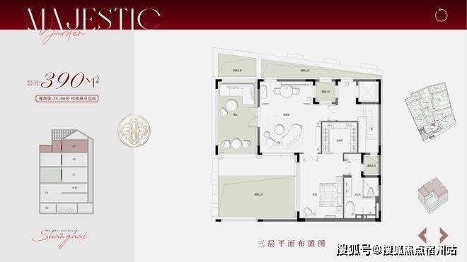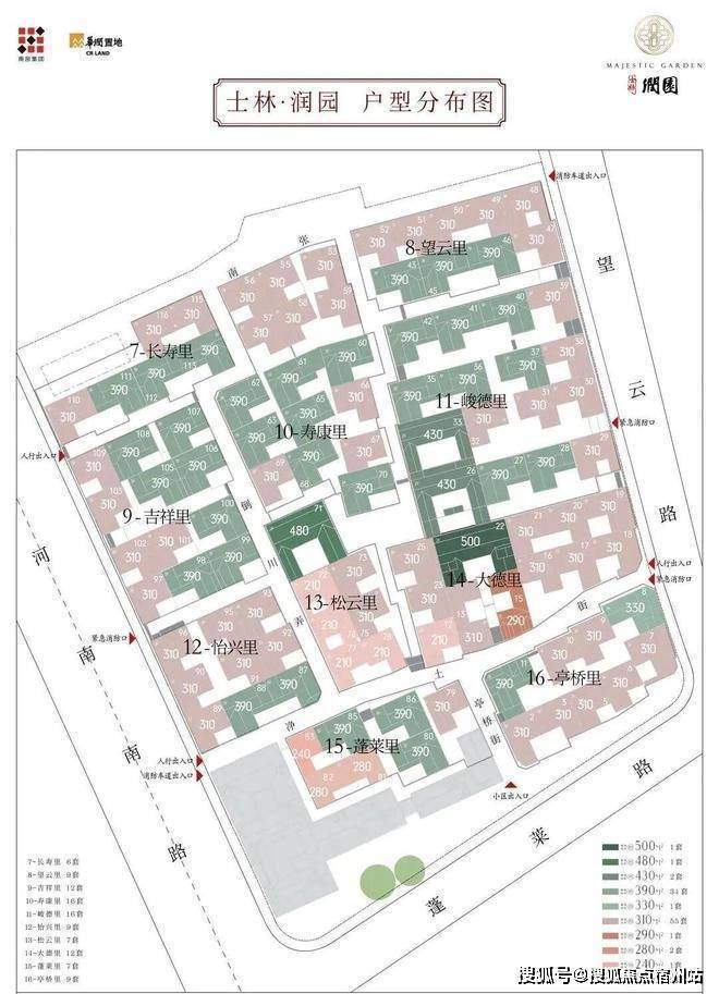 合院地上三层,面积段约270-500㎡,计合院82套。