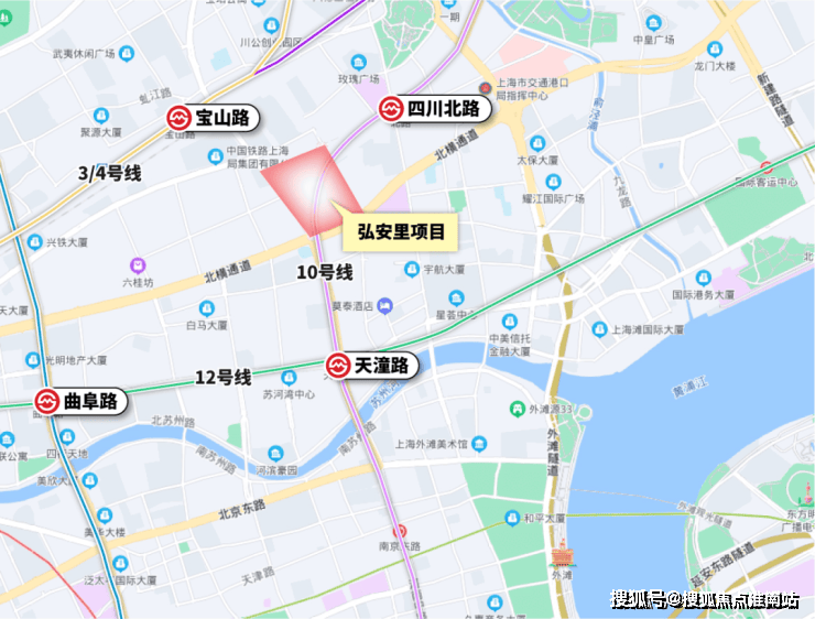 项目距离北外滩核心区,只隔了一条海宁路,距离外白渡桥、外滩源、苏州河都在直线约900米范围内。项目靠近轨交10号线四川北路站,周边还有3号线、4号线、12号线。