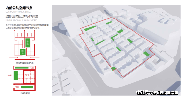 庭院位于关键节点的交汇处,增加空间层次,界定组团边界;