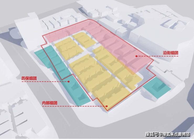 另外,从组团上看,分为历史保护组团、内部组团、沿街组团: