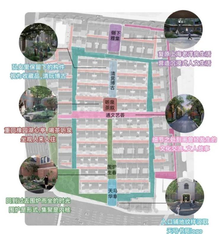 在社区的中轴上,弘安里植入记忆的符号与生活的画面,从入口处「天马华章」迈步前行,「围炉生春」「通文艺荟」「听泉茶叙」「清赏博古」贯穿到此次实景开放的「樾下雅集」,海派生活画卷昨日重现。
