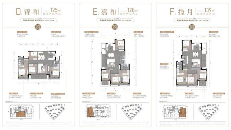 三房户型96,107,108方(已售罄)。四房户型125(仅剩4席),128(售罄),139方(剩余主力在售),楼王139方南厅,168方(剩余可选)。