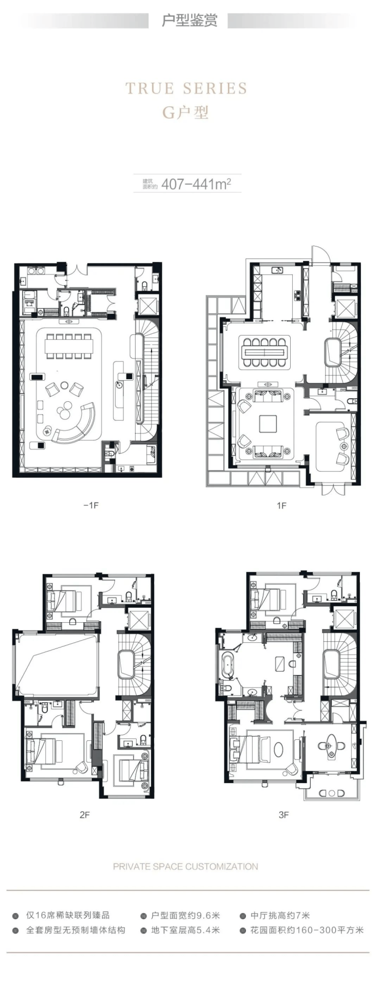 在售户型:建面约310-410平米,地上三层地下一层