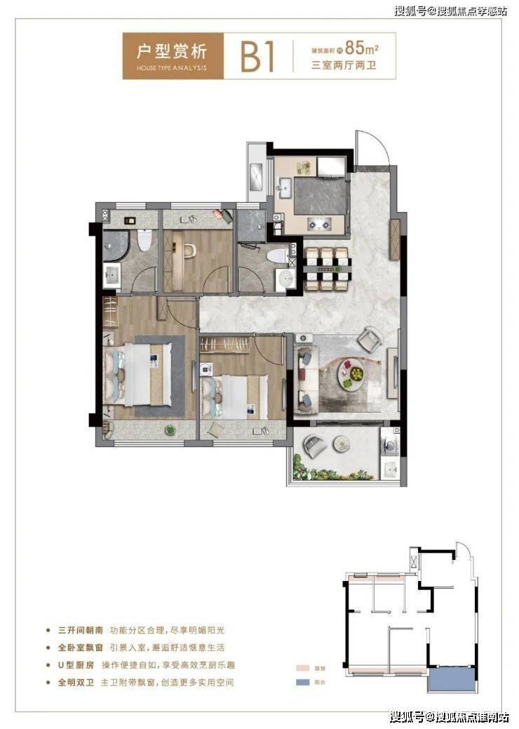 市面上绝大部分80+㎡户型做到三房已是极致,但项目建面约85㎡户型不仅实现3房功能性一步到位,甚至做到了2卫,舒适度和私密性更上一层楼!