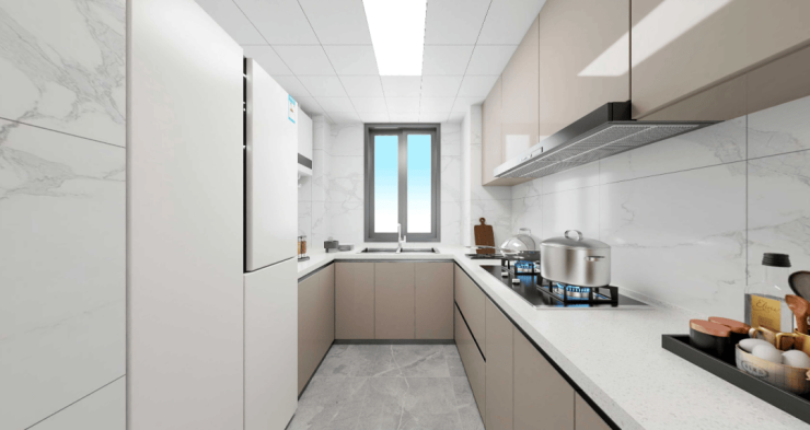 厨房为U型布局,配置定制橱柜、老板烟灶、林内热水器,台面为人造石,水槽为邦克台下盆,细节处体现人性化考量。