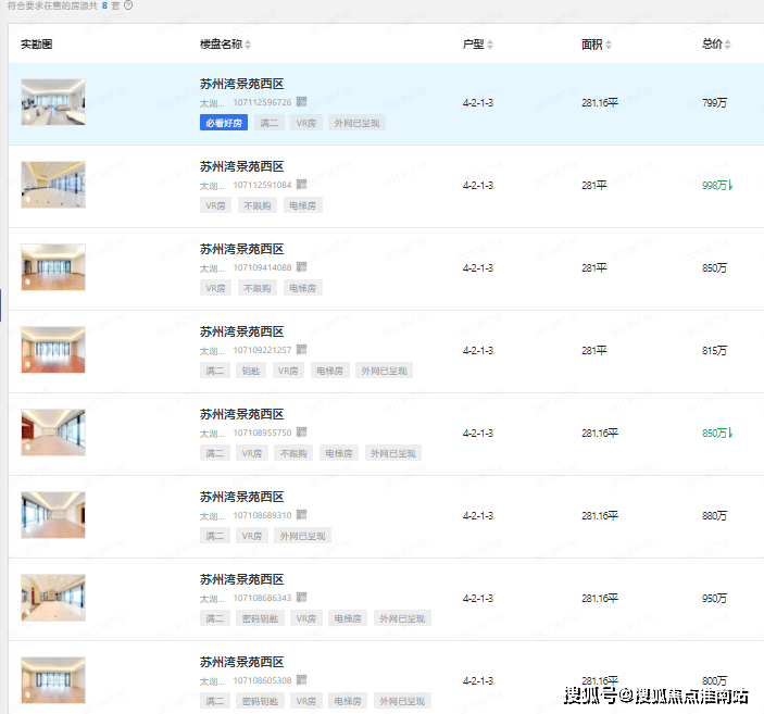 接下来,看看最新一栋,21号楼的成交行情,281平的去年开始不限售,能卖了,不过价格比较“乱”。首先看看挂牌价格,基本上挂牌在800万左右,目前贝壳挂牌8套左右。