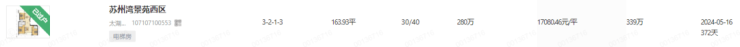 苏州湾景苑因其不可复制的位置以及稀缺湖景,加上其产品质量,被定义为豪宅一点不为过,曾经是很多人可望不可及的,但是近两年价格也是扛不住的。