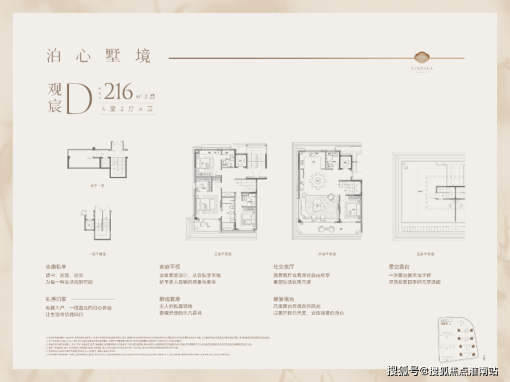 户型特点:下叠边套,南向面宽约9米,客餐厅同宽约5.8米,空间开阔。一楼设南向卧室,采光好且视野佳。二楼为三套房+主卧总统套房设计,主卫南向,可容纳浴缸和双台盆。地下室方正,附赠采光井,利用率高。功能优势:私密性强,景观资源优,适合追求低密墅居生活的家庭。
