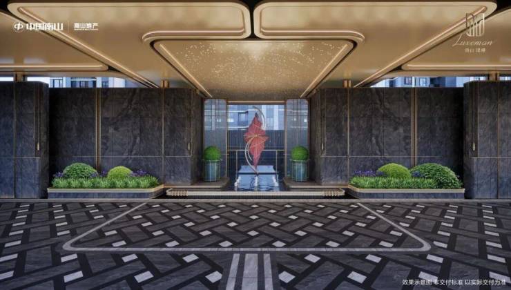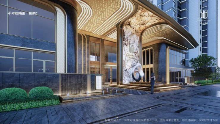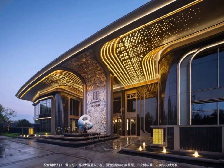墙体采用约雪山蓝石材,搭配香槟色铝板,普拉达绿石材、安哥拉黑石材、真石漆保温一体板与大面积落地玻璃,叠水小品迎宾启幕归家礼序。景观雕塑,将“缦奢归璞”所追求的圈层礼制得以具象。敕造奢阔实景,境现嘉定主城高阶圈邻。