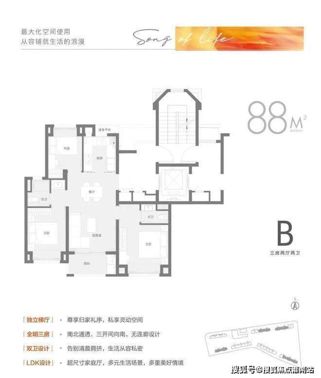 该户型竟做到惊人的3房2卫,你要知道88㎡常规户型要么是2房1卫,要么3房1卫