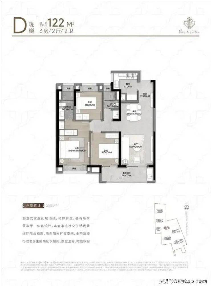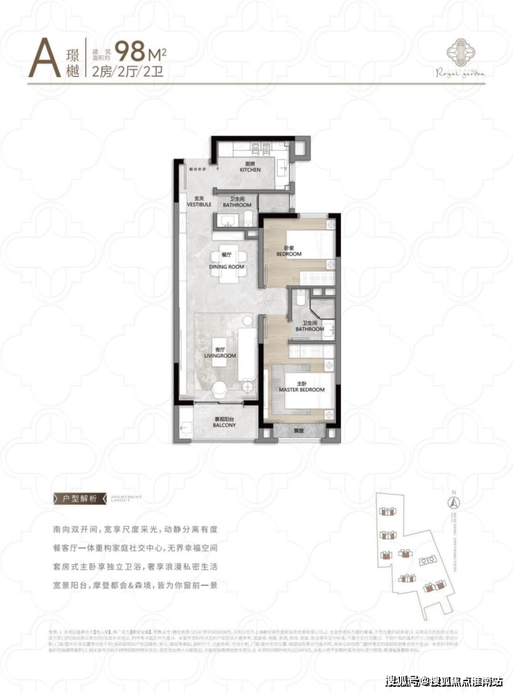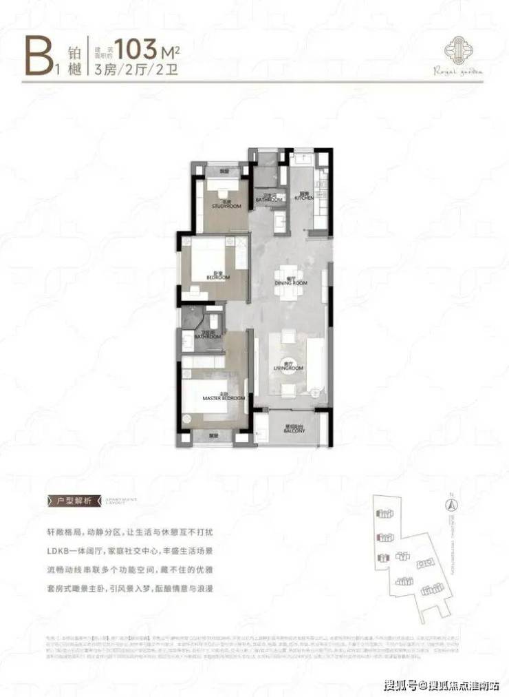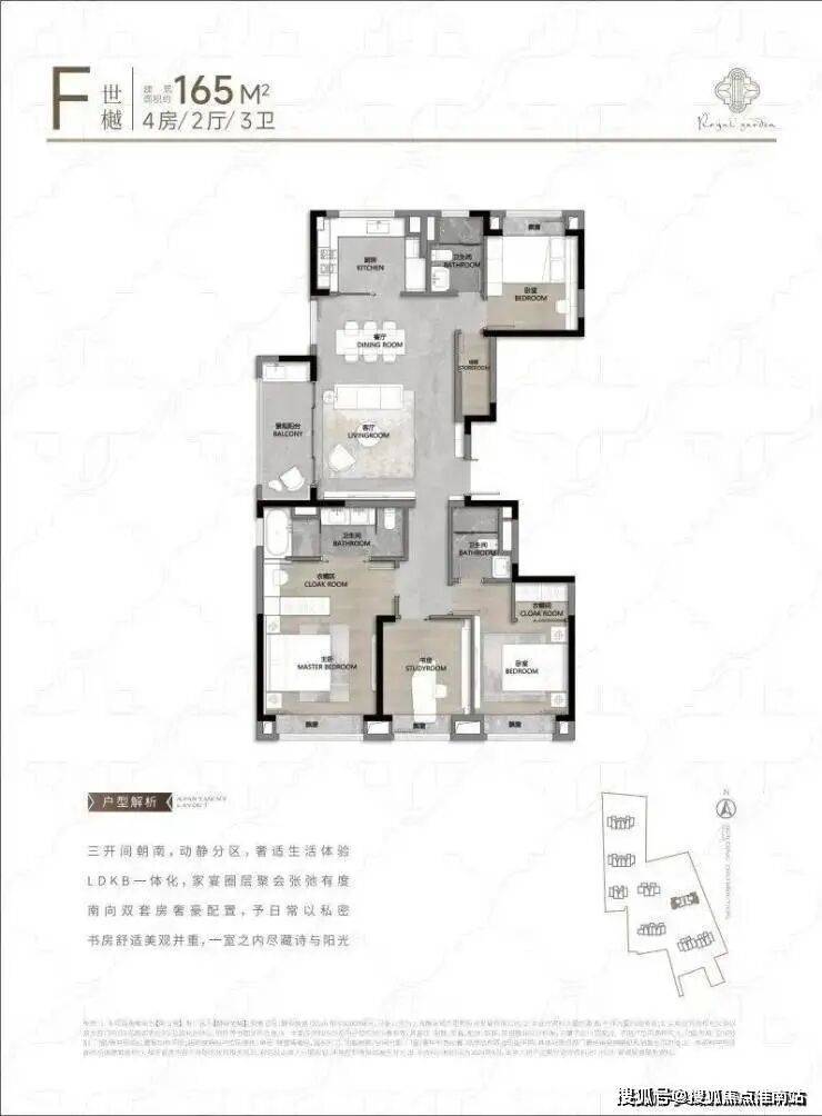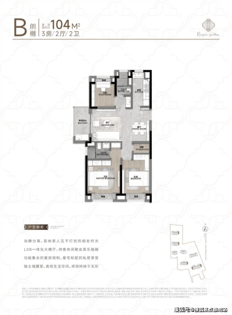 104㎡3户型特点:该户型多为楼栋的东边套,是一个观景户型。客厅连接270°阳台,视野出众。双卧朝南,阳光满溢。从次卫布局看,如果家庭人口较少,该户型还能做成双套卧。