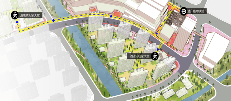 项目联通城市轨交、快速直达主干道和开放街区步道,打造三重立体路网体系,构筑组织多样性,实现快耍慢活的生活节奏,并借此串联起TOD大城里的商业、公园、街区、广场、地铁、酒店,六大场景。