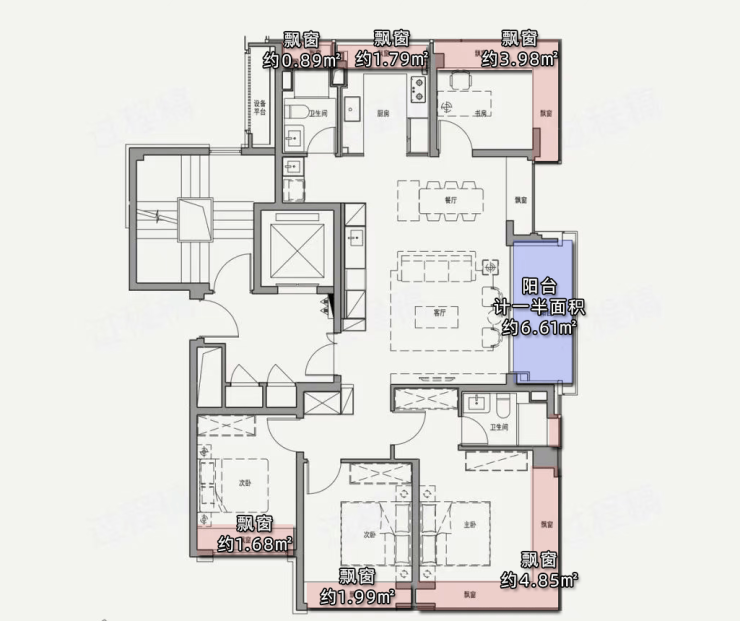 项目百平三房,在计算阳台一半面积+飘窗赠送面积的情况下,实得率可以达到91%左右,完美覆盖了当下普通高层的得房率痛点。