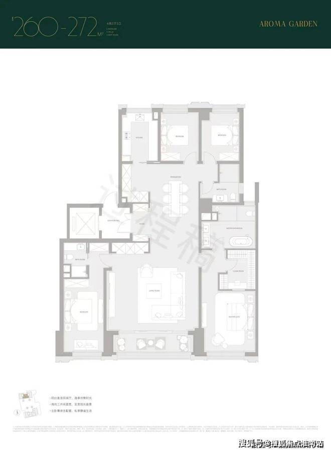 建面约260/272㎡, 南向双套房,尤其主卧是豪华套房 ,带独立衣帽间,卫浴间含双台盆+淋浴+浴缸+马桶四件套。