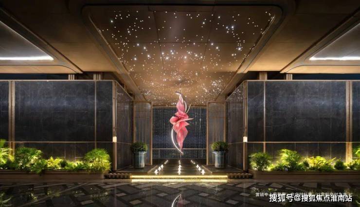 下沉式环幕庭院,跌水景观环绕,池底仿黑金砂与宝石晶片闪烁,点缀百余灯珠,师法“琉璃水光” 形意,糅合视听五感,打造全浸式立体园境,天工巧夺,嘉定未见。