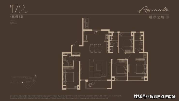 建面约172㎡4房户型,多娃家庭的进阶之选!奢阔尺度尽显家族气度!2梯2户, 子母双开门礼序入户,私密尊崇门厅;约16米四开间朝南,搭配约6米尺度横厅,揽四时风景入怀。