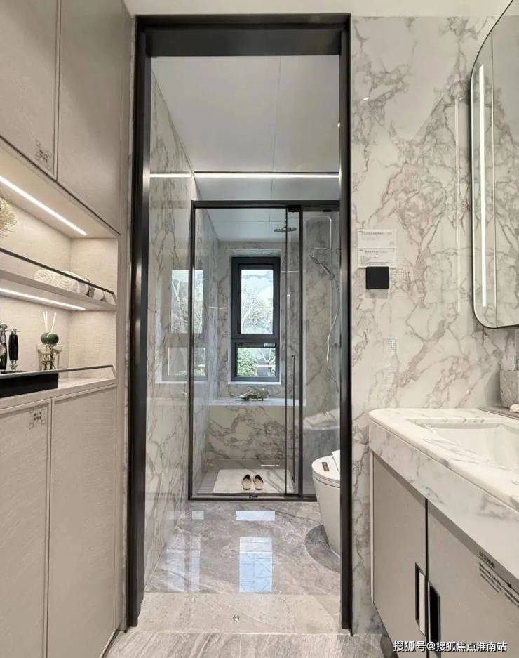 次卫的S墙则安排在了干湿分离的干区,算上台盆上面的收纳柜足以放下各类洗护用品。而且次卫台盆下方还预留了扫地机器人上下水。