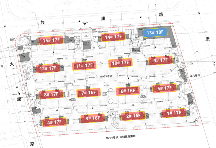 四至范围:东至15-06地块(公共绿地)、南至15-04地块、西至大康路、北至共康路,占地面积43500㎡,总建筑面积140051.13㎡,容积率2.20,总户数957户。