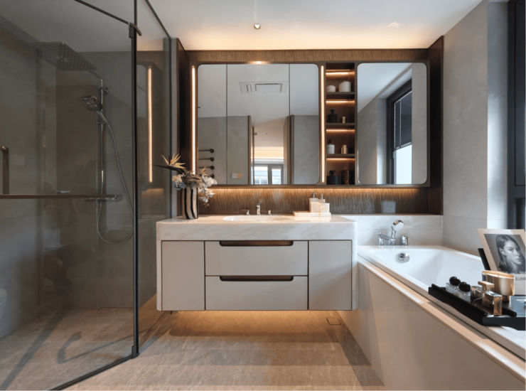 卫浴精工系统:主卫墙面满铺大规格岩板,搭载高仪零售端顶配花洒与杜拉维特隐藏式智能马桶,细节对标3000万+顶豪;