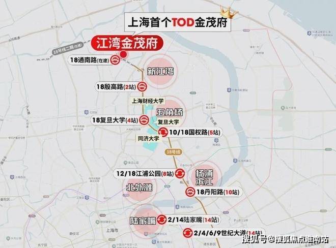 从18号线通南路站(在建,预计年底通车)出发,1站就是新江湾,3站财大,4站复旦,5站五角场,7站新华医院,10站杨浦滨江,11站陆家嘴滨江...