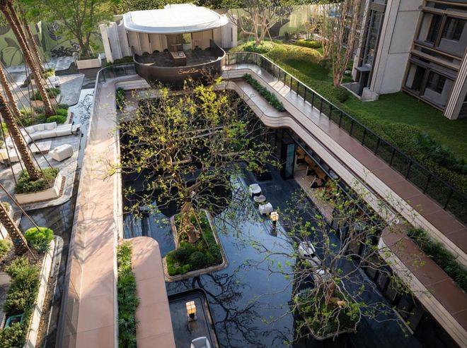 实景呈现的岛屿水院,作为保利天奕五座全球大师花园之一,在银海枣树阵、下沉式庭院、镜面池畔卡座的呼应中,成为未来居者沉浸自然的惬意之地。温柔闲适的落日廊吧,犹如身处海岛之畔,感受蓝调时刻的优雅情调。
