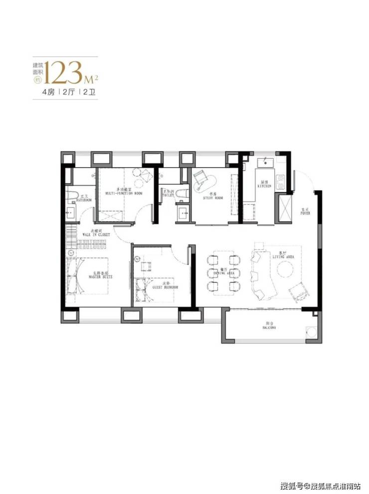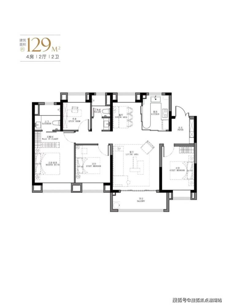 产品:103㎡、107㎡的三房两厅两卫及123㎡、129㎡的四房两厅两卫。