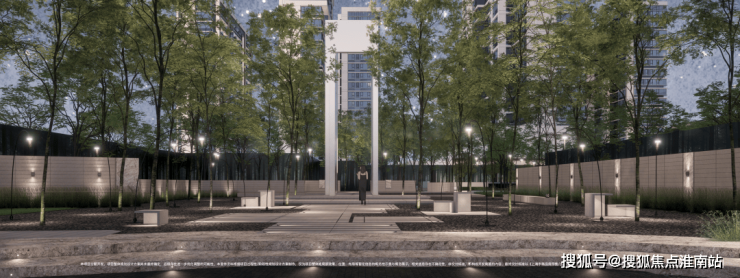 第二重归家礼序:步入社区,首入眼帘的是6米高水幕的下沉式山水庭院,这也是未来实景示范区的开放区域的所在。